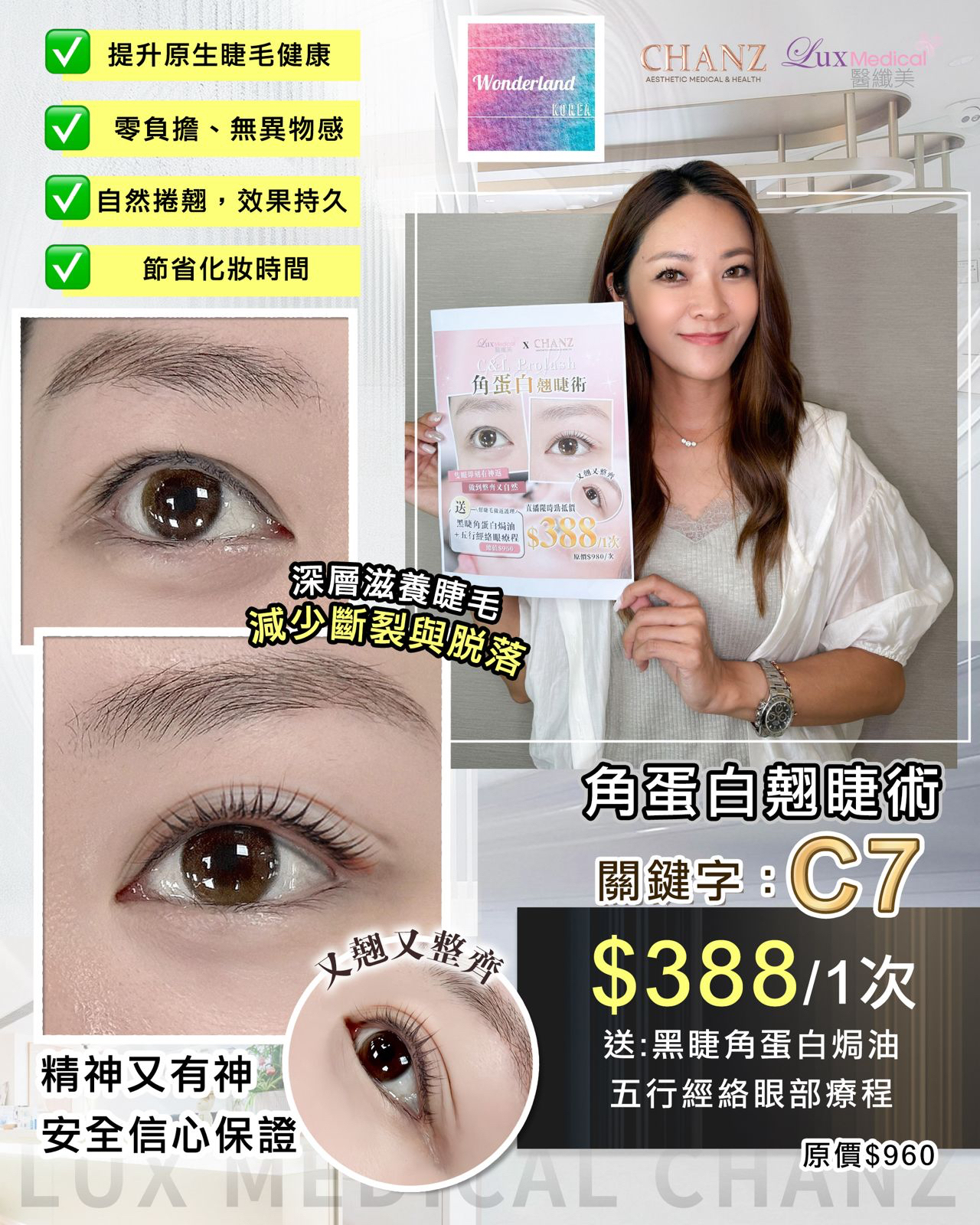 🔺凡購買面部療程即送一次A I面部分析價值$980 直播超筍優惠價$388(原價$980) 🔆贈送🔆 黑睫角蛋白焗油($280) 五行經絡眼部療程($680) 想擁有自然捲翹、根根分明的美睫?體驗專業角蛋白翹睫術,輕鬆打造迷人大眼👀魅力! 角蛋白翹睫術的好處💯 • 自然捲翹,效果持久:療程後睫毛即時呈現理想弧度,捲翹度維持長達6-8週。 • 提升原生睫毛健康:角蛋白精華深層滋養睫毛,令睫毛更強韌、豐盈、有光澤,減少斷裂與脫落。 • 素顏也魅力動人:維持睫毛彈性和自然弧度,無需睫毛夾或假睫毛,妝前妝後都迷人,看起來即精神又有神。 • 節省化妝時間:輕鬆打造美睫,減少每日化眼妝及卸妝步驟,出門更快捷方便。 • 零負擔、無異物感:利用自身睫毛進行塑型,不會有厚重或不適,貼合日常需要。 安全信心保證 本店療程全程使用之角蛋白產品,已通過SGS✅安全檢測,確保安全有效,讓你美得更安心。 立即預約,開啟屬於你的美睫新「睛」界! 使用店: 旺角 銅鑼灣